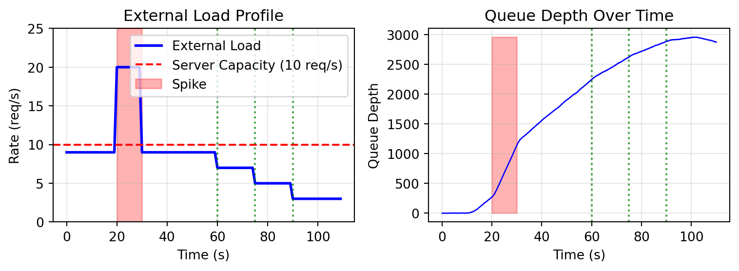 print(f" Post-spike at 9 req/s (35-60s): {avg_depth_in_range(35, 60):.1f}")