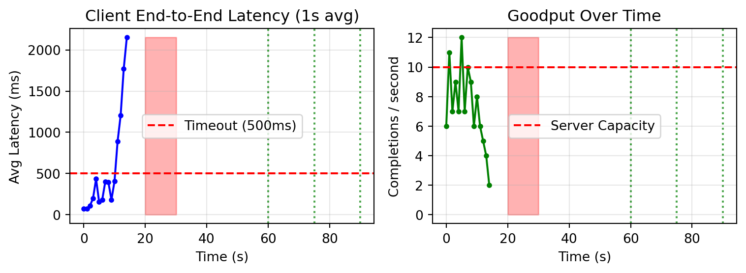 The demonstration is (probably) the simplest possible example of metastability: sustained degradation due to retries due to timeouts due to queue wait times.